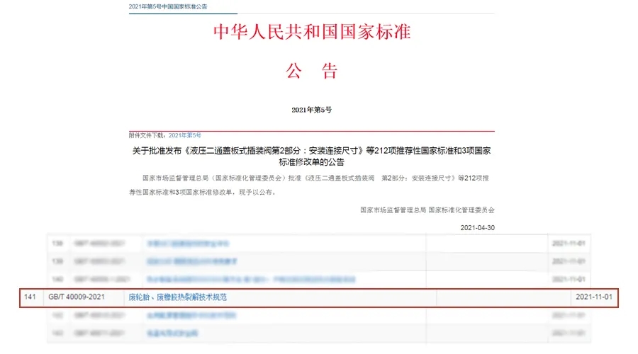 2021年4月30日,國家市場監(jiān)督管理總局、國家標(biāo)準(zhǔn)化管理委員會發(fā)布2021年第5號中國國家標(biāo)準(zhǔn)公告,批準(zhǔn)了《廢輪胎、廢橡膠熱裂解技術(shù)規(guī)范》等國家標(biāo)準(zhǔn)。