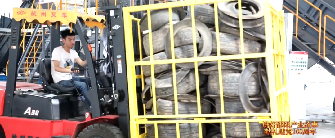 “一輛輛小車滿載著廢舊輪胎進入廠區(qū),卸下的廢舊輪胎隨即被運送到上料區(qū),經(jīng)過智能切割和清洗后再運送到智能裂解裝備中”;