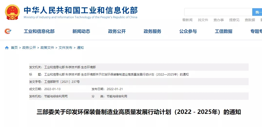為貫徹落實(shí)《中華人民共和國國民經(jīng)濟(jì)和社會發(fā)展第十四個五年規(guī)劃和2035年遠(yuǎn)景目標(biāo)綱要》以及《“十四五”工業(yè)綠色發(fā)展規(guī)劃》,全面推進(jìn)環(huán)保裝備制造業(yè)持續(xù)穩(wěn)定健康發(fā)展,提高綠色低碳轉(zhuǎn)型的保障能力,近日,工信部、科技部、生態(tài)環(huán)境部聯(lián)合發(fā)布了《環(huán)保裝備制造業(yè)高質(zhì)量發(fā)展行動計劃(2022-2025年)》。