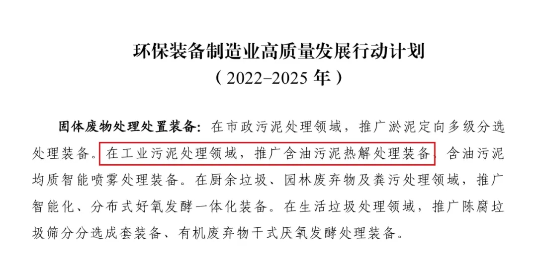 “計劃”中提出“在固體廢物處理處置領(lǐng)域,重點(diǎn)推廣無害化資源化利用技術(shù)裝備。在工業(yè)污泥處理領(lǐng)域,推廣含油污泥熱解處理裝備。”