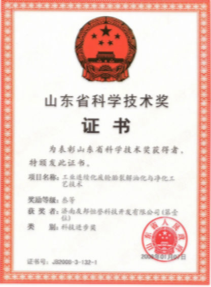 2009年1月7日,公司《工業(yè)連續(xù)化廢輪胎裂解油化與凈化工藝技術(shù)》被授予“山東省科學(xué)技術(shù)獎(科技進(jìn)步獎)”
