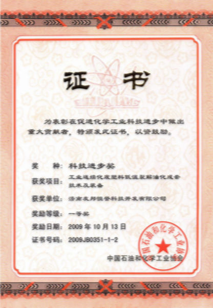 2009年10月13日,公司《工業(yè)連續(xù)化廢塑料低溫裂解油化成套技術(shù)及裝備》項目榮獲中國石油和化學(xué)工業(yè)協(xié)會科技進(jìn)步獎