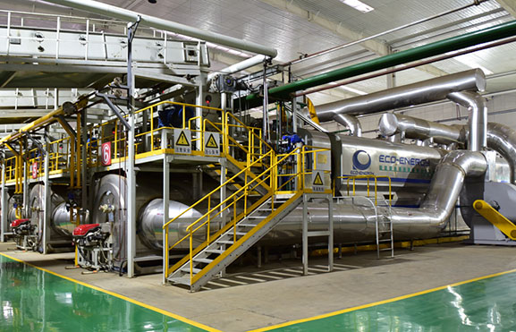 生產(chǎn)所需熱能完全由油泥殘?jiān)鼰峤猱a(chǎn)生的不凝可燃?xì)饣蛉剂嫌吞峁?,且采用余熱循環(huán)供熱方式,大大節(jié)省了能源消耗,降低了生產(chǎn)線運(yùn)行成本